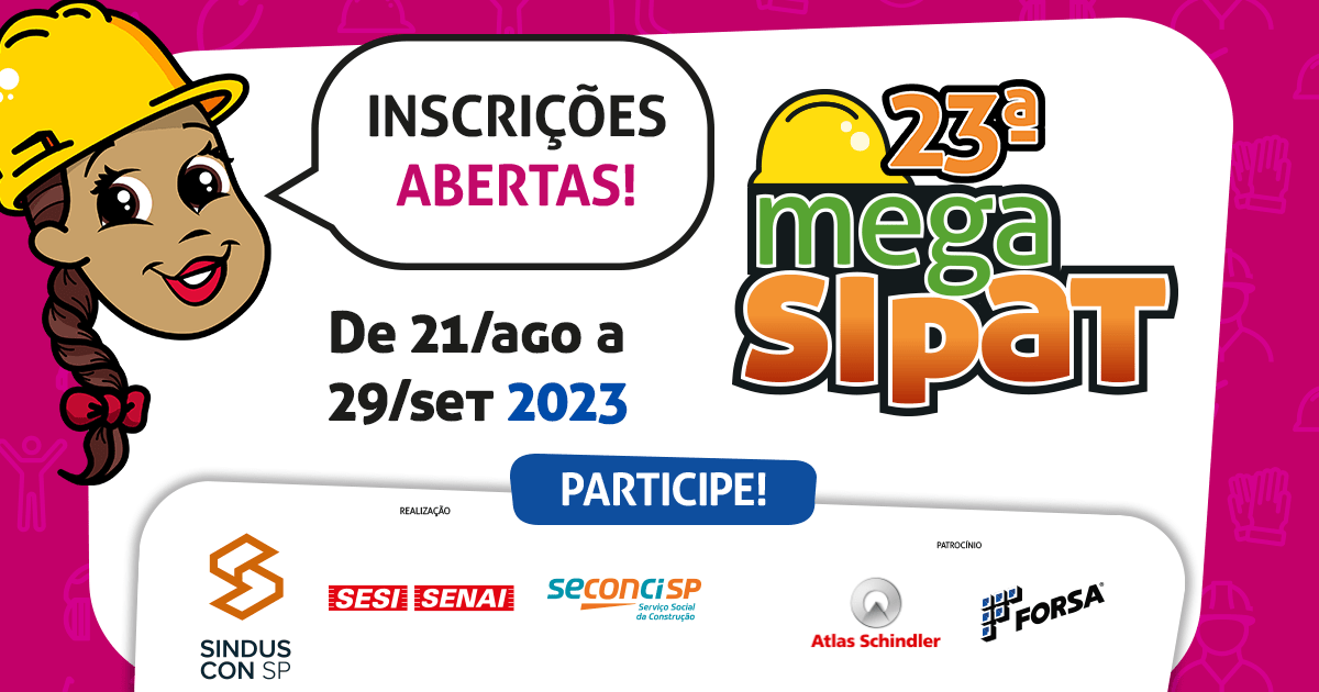 As associadas do SindusCon-SP e as contribuintes do Seconci-SP já podem inscrever seus canteiros de obras na 23ª edição da MegaSipat (Mega Semana Interna de Prevenção de Acidentes do Trabalho): de 21 de agosto a 29 de setembro. Entre os diferenciais dessa edição estão a presença de profissionais para realização de palestras especificas por parte do Seconci-SP e orientação para atividades físicas e ginastica laboral do SESI-SP; além das palestras desenvolvidas pelos técnicos do PSS e tradicional sorteio de brindes.